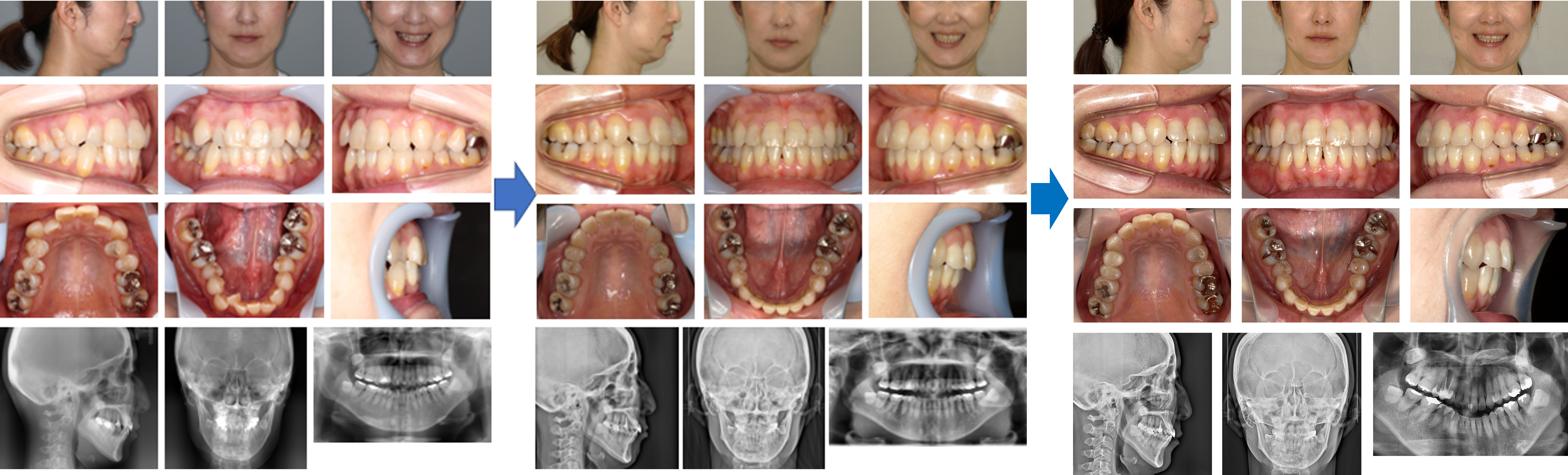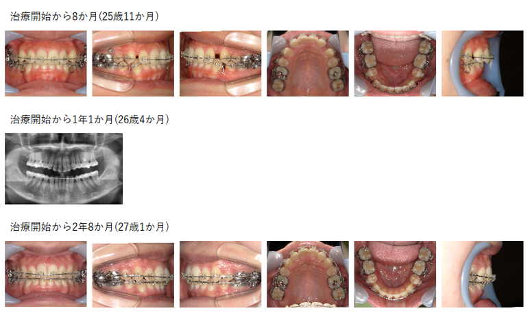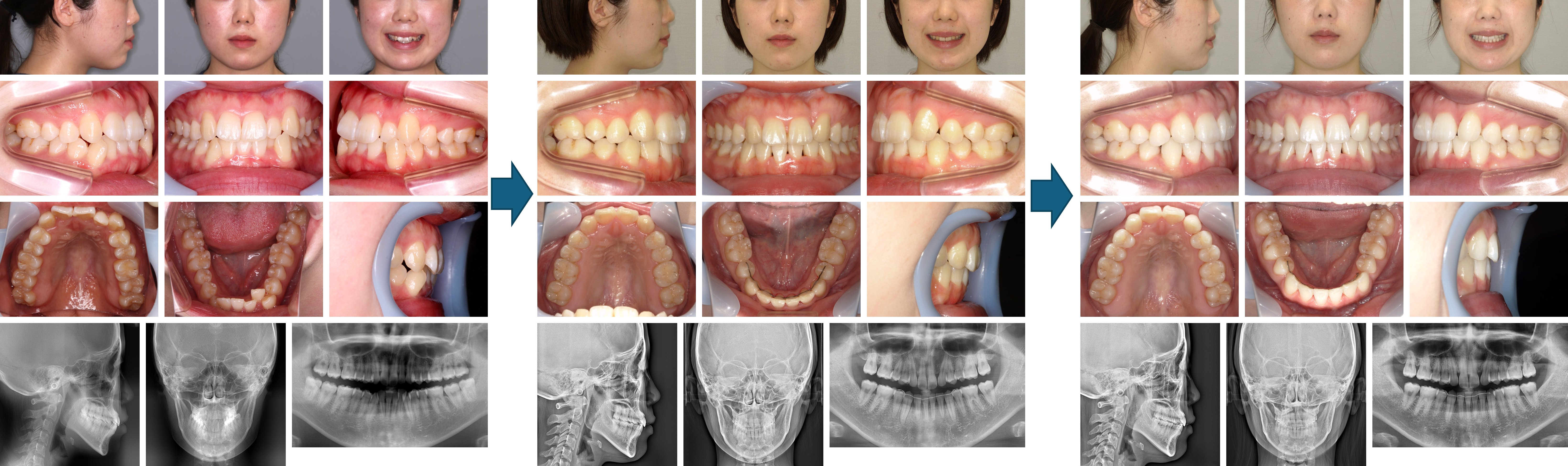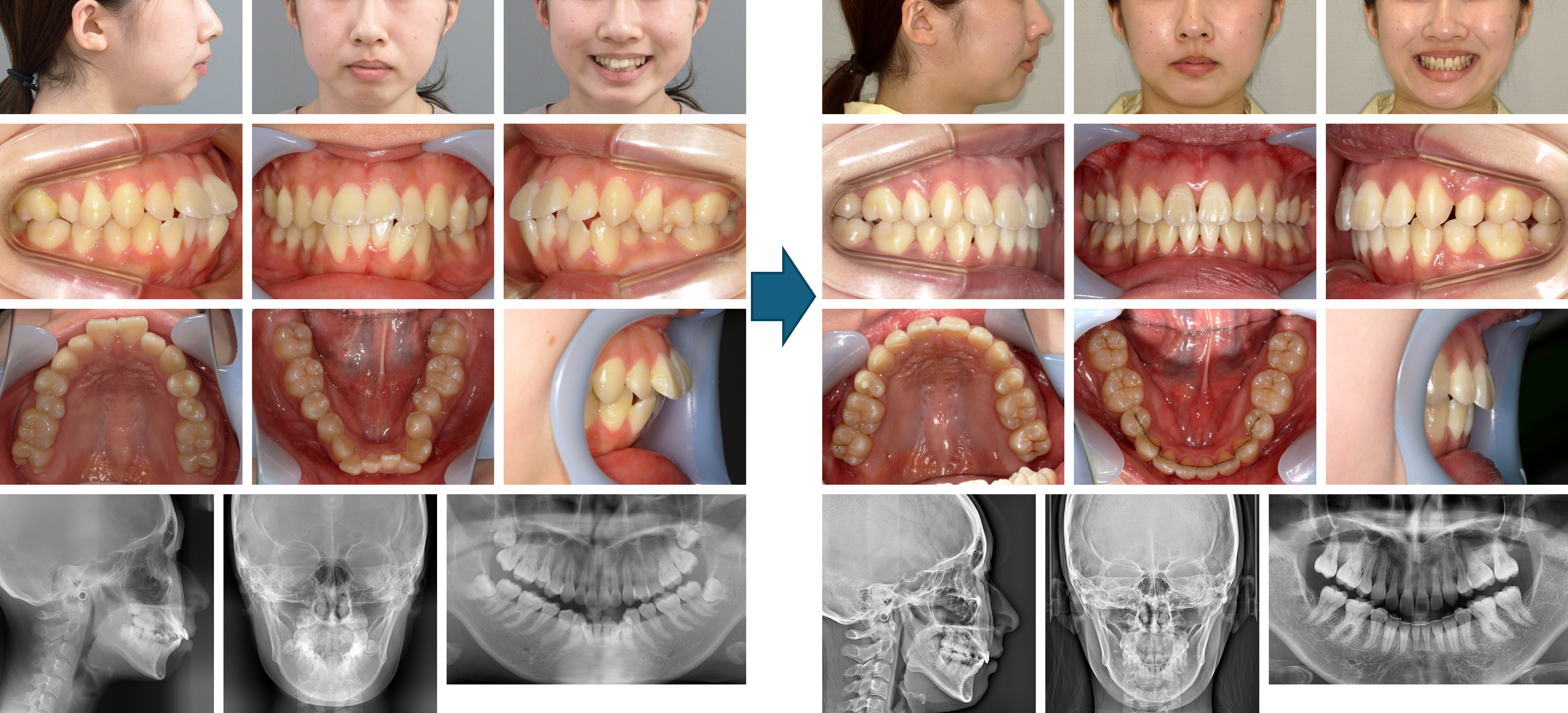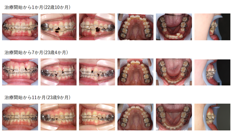 使用した主な装置:クワドヘリックス装置、バイヘリックス装置、マルチブラケット装置(ハーフリンガル)、顎間ゴム