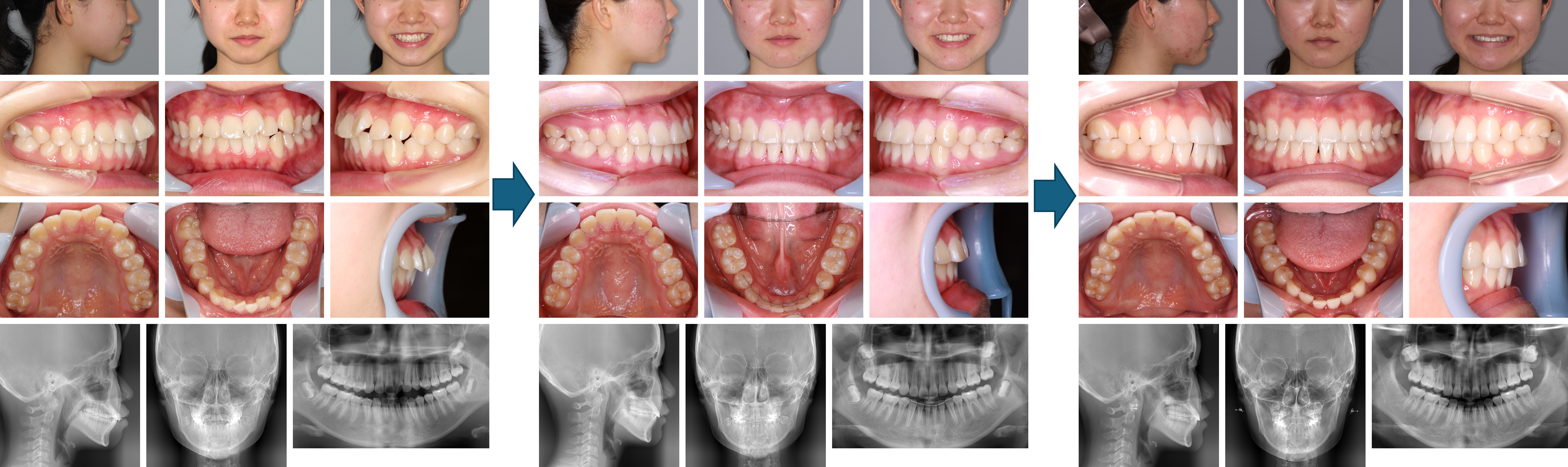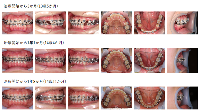 使用した主な装置:マルチブラケット装置、クワドヘリックス、ハイプルヘッドギア、トランスパラタルアーチ、顎間ゴム