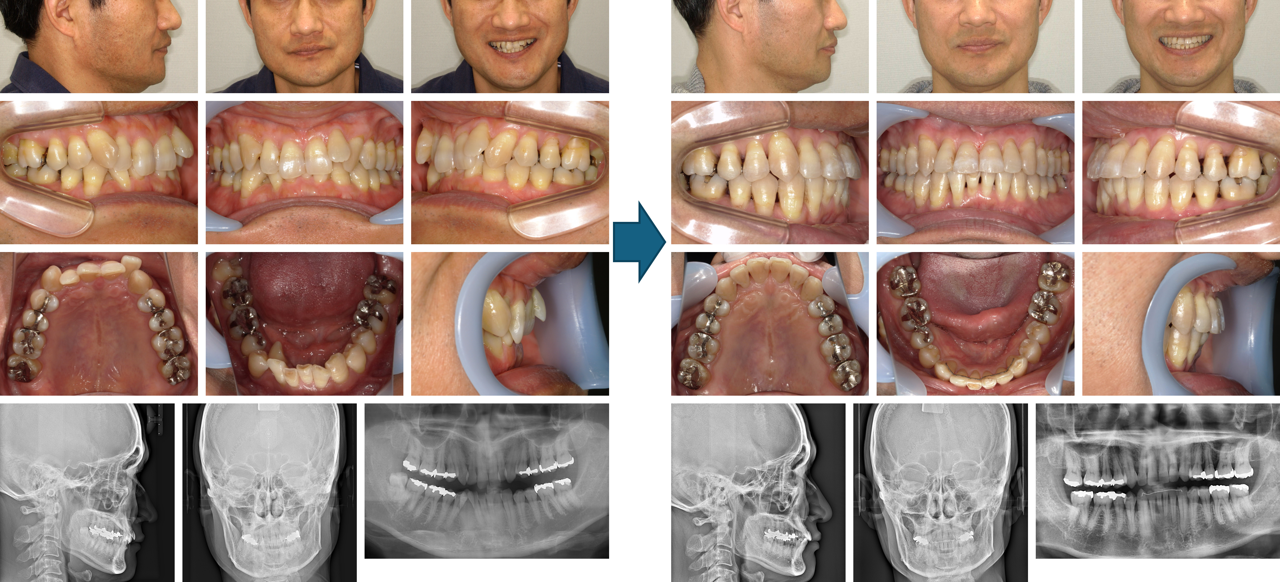 症例の概要:この症例は上下の咬み合わせが悪い事とたまに朝に口が開かない事を主訴に来院された。下顎前歯1本(右下2番)が先天性欠如のほか、両側第一小臼歯が鋏状咬合を呈していた。口元の突出感を認めたことから上顎両側第一小臼歯を抜歯した。その結果、開口障害も無くなり、口元の突出感や咬み合わせも改善した。