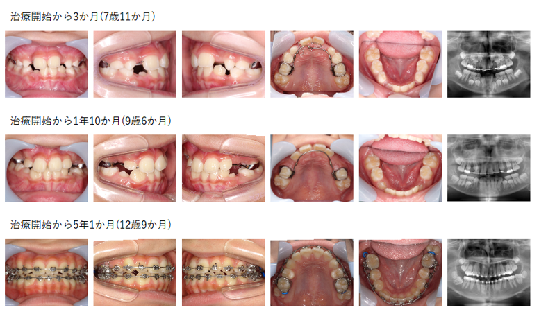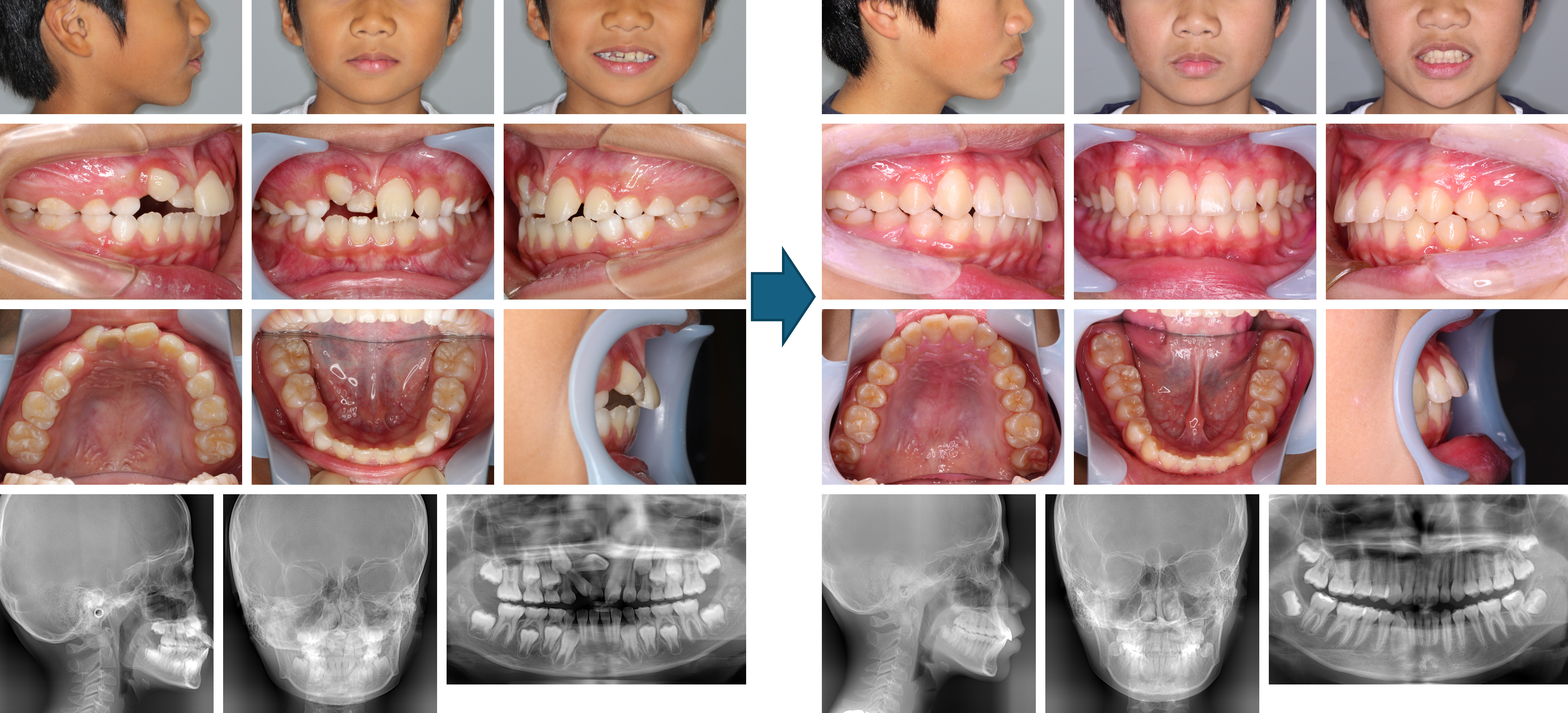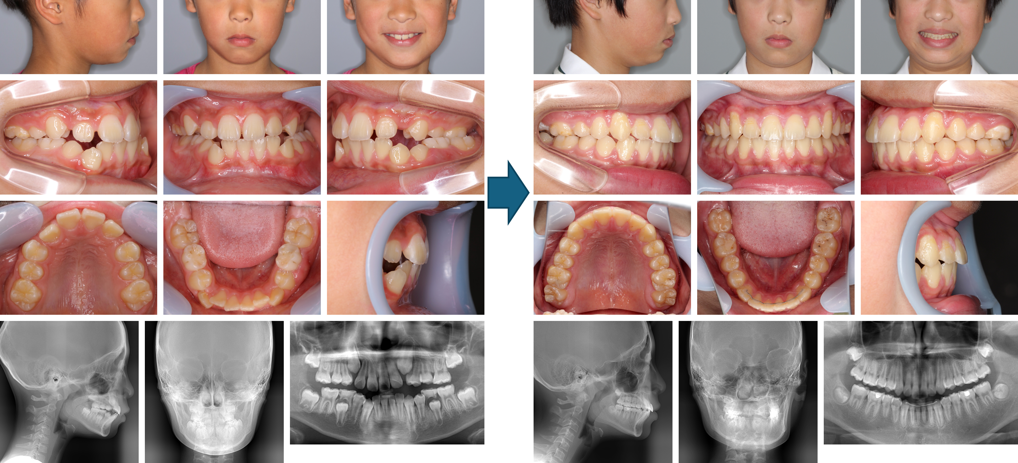 使用した主な装置:マルチブラケット装置、クワドヘリックス装置、上顎前方牽引装置、顎間ゴム