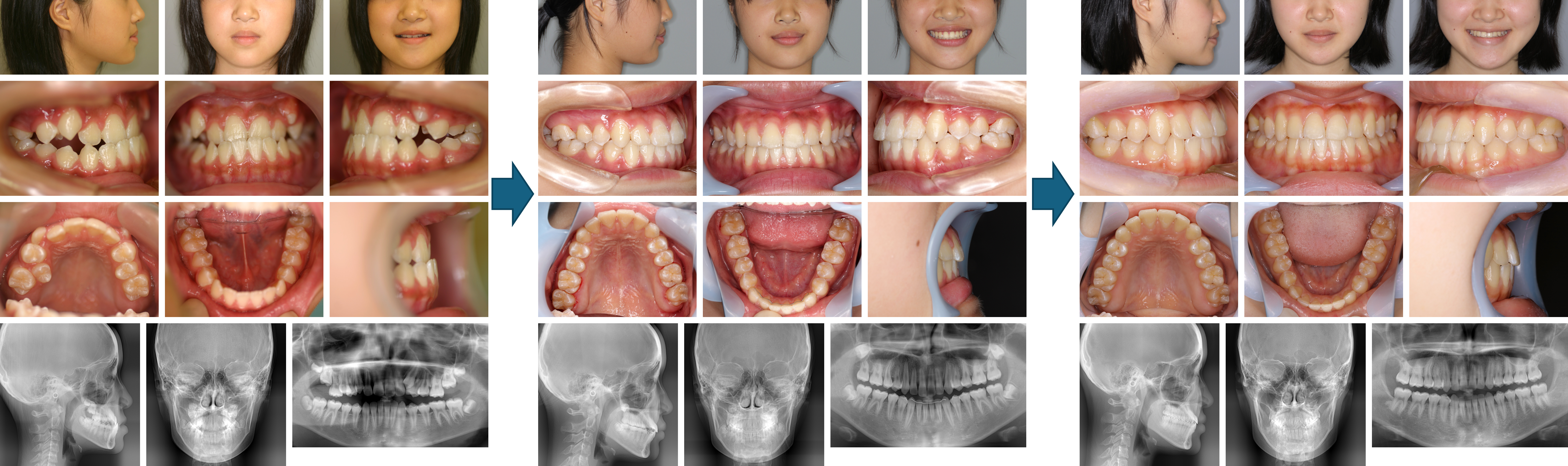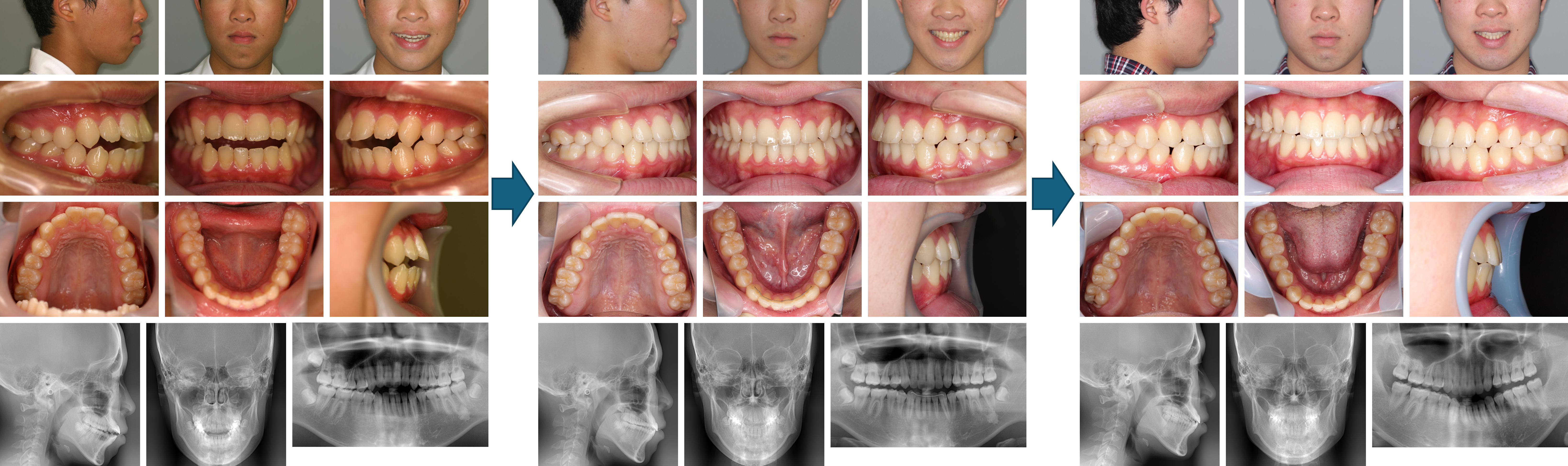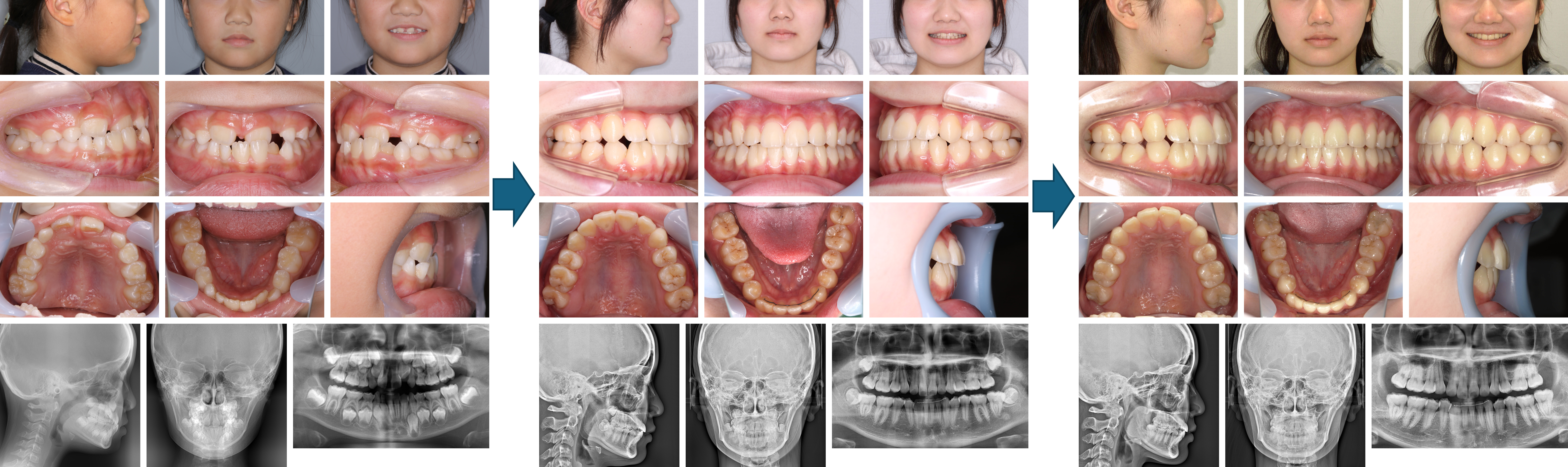 使用した主な装置:マルチブラケット装置、クワドヘリックス装置、上顎前方牽引装置、顎間ゴム