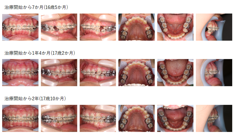 使用した主な装置: リンガルアーチ、マルチブラケット装置、チンキャップ、顎間ゴム、歯肉切除