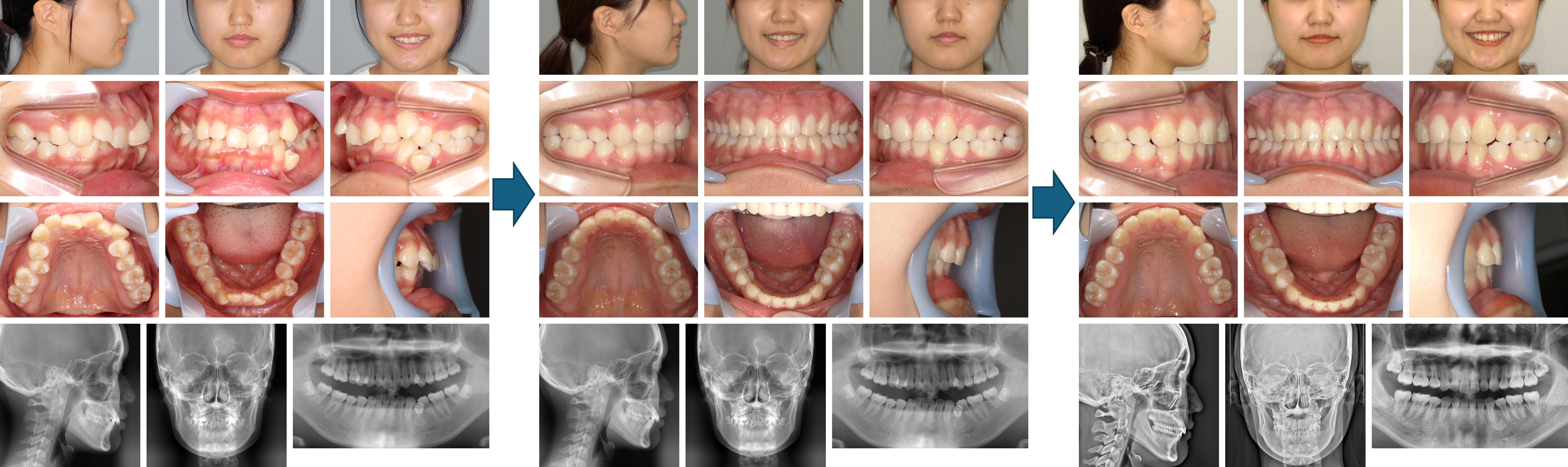 使用した主な装置: 側方拡大床、サービカルヘッドギア装置、2×4装置、マルチブラケット装置